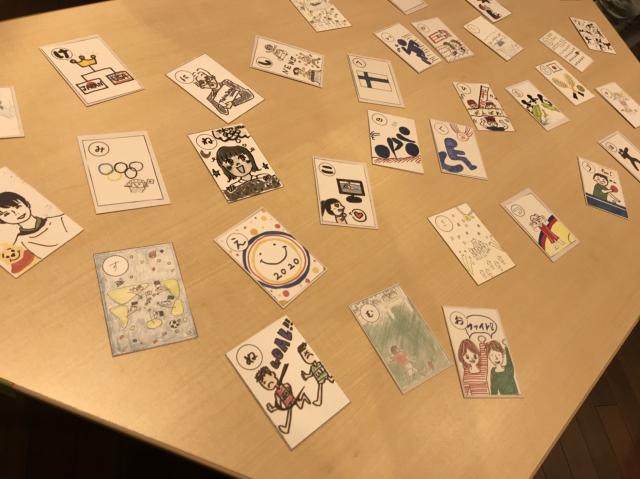 国際交流プロジェクトが今回の交流会で1番力をいれたオリジナルの「手作りかるた」。かるたの読み札の文から国際プロジェクトメンバー全員で考え、イラストも手書きで作成し、オリジナルのオリンピックかるたを完成させました。留学生もイラストを気に入ったのか、かるたに夢中。