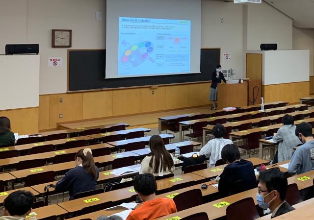 今回の寄附講座は「経営学特講(資産マネジメントの視点)」(担当:西山由美経済学部教授の授業)にて開講。