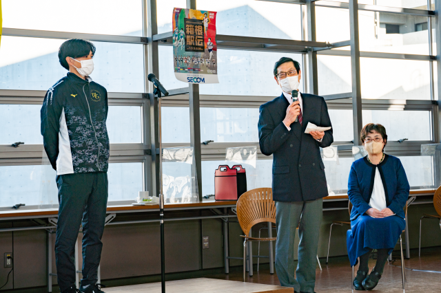 村田学長からは、「駅伝に参加している陸上競技部の選手の皆さんの力で着実に実力が上がり、このような成果を積み上げてこられたことに感謝します」とチーム全体への労い、榎本選手への応援がありました。