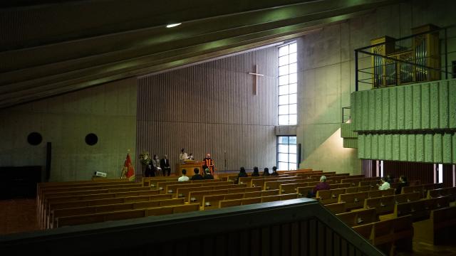 横浜キャンパスのシンボル、横浜チャペルには、国際学部の新入生、国際学部教員、保証人の皆様をはじめとした学内関係者が出席。