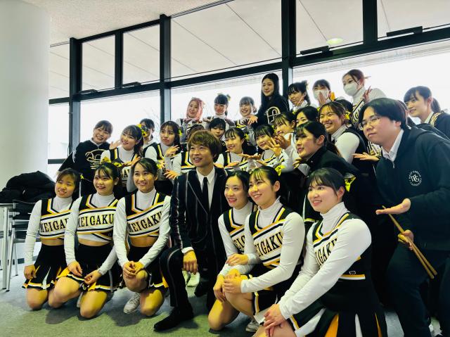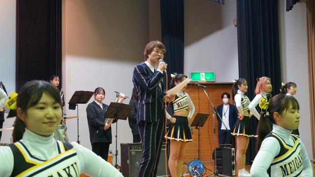 3/26(火)に横浜キャンパス7号館720教室にてチアリーディング部およびブラスバンド部、そして茂木さんが在学中に所属していたサークルのソング・ライツが新応援歌を披露しました。
