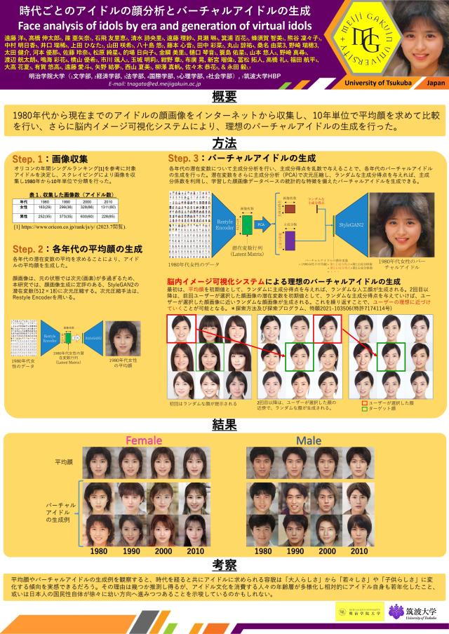 | 永田 | 私はもともと研究のネタを探していたようなところがあって、学生と一緒に何か面白いことをやりたいと思っていました。授業内アンケートで遠藤さんが「人気のある顔の時代ごとの変遷について知りたい」という面白い質問をしてくれました。私の知る限り、断片的には研究されているものの、網羅的な研究はないことに気づき、これはとても良い研究テーマになると思いました。なぜなら、顔を研究する方なら、誰もが興味を持つテーマである一方、網羅的な収集が大変であるため、手が付けられていなかったからです。幸い私の講義の履修生は約800名いましたので、声をかけてデータを収集すれば、実現できると思いました。また、私は今回のフォーラム顔学2023の実行委員でもありましたので、当初からフォーラム顔学2023での発表を念頭に置き、計画的に研究を進めていました。manabaの掲示板で、面白いと思うからみんなもやらないか、と声をかけたら49人が声を上げてくれ、その中に高橋さんもいました。 |
