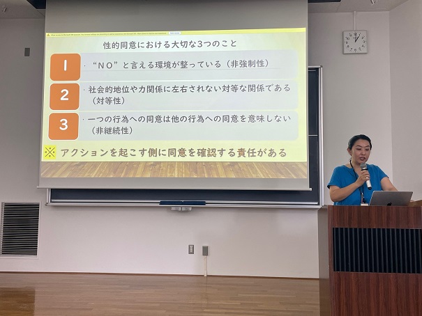 留学生によるラウンドテーブルに次いで、健康支援センター(横浜)の芥川愛保健師の有益な講義が行われました。性的同意の定義、同意のために必要な基準の概要、そして、同意がないことによって性暴力が引き起こされるということが説明され、また、性的に親密な関係を築こうとする側は、相手が快適で安全であることを確認する責任があるということが強調されました。さらに、学内外での重要なリソースが紹介されました。:性犯罪・性暴力被害者のためのワンストップ支援センター(#8891[はやくワンストップ])、横浜健康支援センター(045-863-2020)、横浜ハラスメント相談支援センター(045-863-2218)