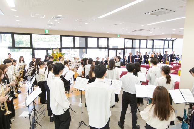 式典後に開かれた祝賀会・懇親会では来賓の近藤 武戸塚区長、梅原 出横浜国立大学学長からのご祝辞をいただき、本学の管弦楽団の演奏やゴスペルクワイヤの歌唱も添えられた和やかな雰囲気のなか、情報数理学部の開設をお祝いしました。