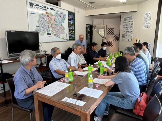 写真は、視察先のコモアしおつ団地管理組合の住民、積水ハウス、地元自治体職員の協議の場面、および流山市まちづくり推進課での協議の場の写真です。鍛冶教授より、写真にあるMG Waterが、移動中でも会議の場でも、黄色ラベルの水のボトルが知の泉を満たし、知的交流を促す一助となったとの報告がありました。