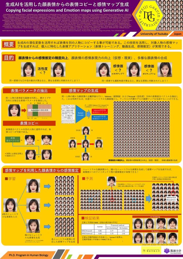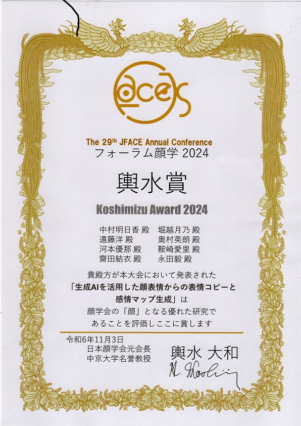 明治学院大学「AI・データサイエンス教育プログラム」の科目「AI・データサイエンス入門」(担当:情報数理学部永田 毅教授)を履修する学生グループによる研究「生成AIを活用した顔表情からの表情コピーと感情マップ生成」が2024年11月2日、3日にかけて行われたフォーラム顔学2024(日本顔学会)にて輿水賞を受賞しました。