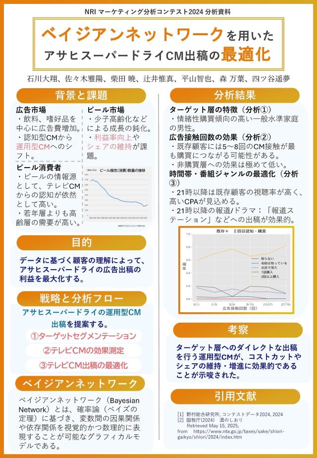 株式会社野村総合研究所が主催する「マーケティング分析コンテスト2024」にて、心理学部心理学科 川端ゼミ3年次(出場時)の学生チームによる研究「ベイジアンネットワークを用いたアサヒスーパードライCM出稿の最適化」が最終候補作品に選ばれました。