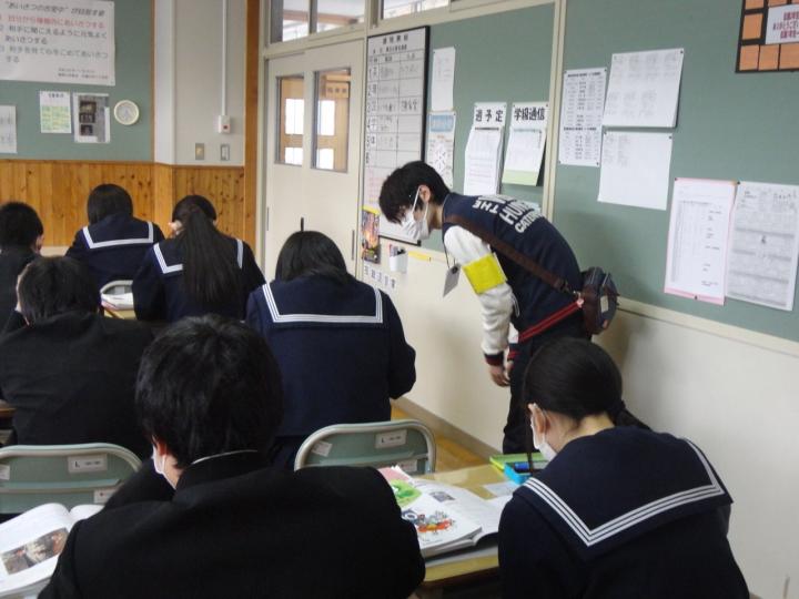 今回は、授業に入らせてもらい、中学生をサポートする活動をしてきました。中学校の時間割通り、1時間目から6時間目まで代わりばんこで授業に参加し、5日目の放課後には、部活に入って生徒と一緒に汗を流しました。