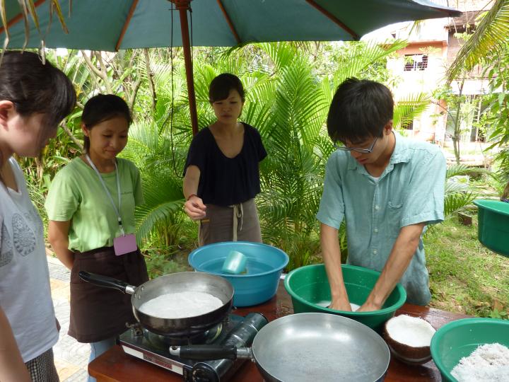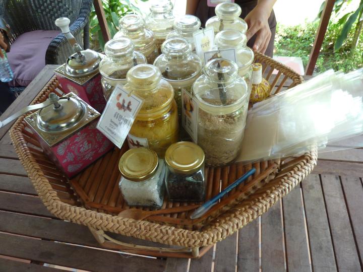 クル・クメールに到着するとスタッフの方に連れられ、庭に生えているハーブの原材料となる植物を紹介していただきました。その後二つのグループに分かれて、オリジナルハーブ作りと足湯を体験しました。ハーブは様々な材料を混ぜ合わると色々な効能を発揮するそうで、皆自分好みにアレンジしていました。足湯はパインジュースとマッサージ付きという極めて贅沢なひと時を過ごしました。