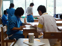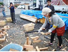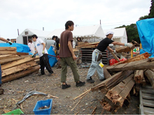 午前はNPO団体「吉里吉里国」が中心となっている「復活の薪プロジェクト」に参加、小学生もこのプロジェクトのお手伝いをしていて、一緒に知恵を出し合いながら釘抜きをしました。また、滋賀県の大学生も参加していました。この日は、閉鎖された避難所の中の片づけをしている方が薪プロジェクトの様子を見にくるといったような光景も度々うかがえました。薪プロジェクトには、釘抜き、薪割り、袋詰めなどといった作業がありますが、今回私たちは主に釘抜きを行いました。
