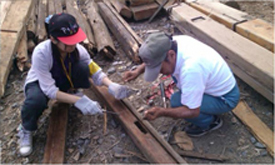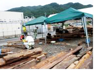 私たちはNPO法人「吉里吉里国」が中心となり活動している“復活の薪プロジェクト”に参加しました。このプロジェクトは、廃材となった瓦礫を利用し薪を作って全国へ販売し、その資金を復興へ役立てていくものです。リーダーである芳賀正彦さんは「災害から5ヶ月が経った今が自立への転換期」だといい「犠牲になった方々へ恥ずかしくないような生き方をしていきたい」と仰っていました。また「山をきれいにすることが海をきれいにすることに繋がることから、森を再生する技術を後世に継いでいくことが大切だ」と考えていらっしゃいます。作業は主に釘抜きをお手伝いさせていただきましたが、男性メンバーがいなかったので他の力仕事や薪割りなどは手伝うことができませんでした。