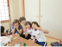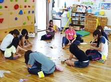 午前中の活動は園庭と室内の2カ所に分かれて過ごしました。外ではサッカーやキックベースなどボールを使った遊びで子どもたちとふれあいました。室内ではお尻鬼ごっこ、ミサンガ作り、うちわ作りや変わり絵作りなどを教えながら共に取り組みました。子どもたちも私たち学生に積極的に関わってくれ、とても楽しんでいる様子でした。
