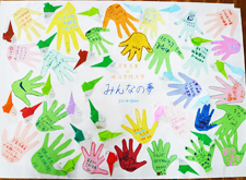 午後の活動は、小学生と学生たち全員が手形に「将来の夢」を描き、1つの作品を作りました。