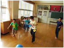 堤乳幼児保育園で吉里吉里小学校の子どもと遊びを通して交流を深めるという活動を行いました。