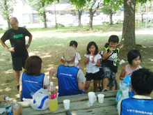わんぱく広場最終日である8月11日(木)は明治学院大学の学生、コーディネーター、スタッフと小学生32名で交流しました。午前は校庭でキックベース・ドッチボールなどのスポーツ大会、室内でミサンガづくりを行い、小学生は参加したい企画を自由に選び、明学生は小学生の活動を補助するという形で交流を深めました。午後は校庭でスイカ割り大会を行いました。『スイカ割り』という夏ならではの企画であったため、小学生たちは順番を待っている間も元気よく方向の指示を出したり、おいしそうにスイカを食べたりするなど好評で、わんぱく広場の最後をとてもいい形で終えることができました。3日間という短い期間ではありましたが、わんぱく広場での小学生との交流を通して、日が経つとともに大学生と小学生の距離が確実に近づいていくのを感じ、継続して交流していくことの大切さを強く感じました。