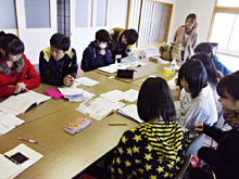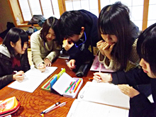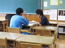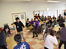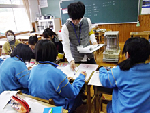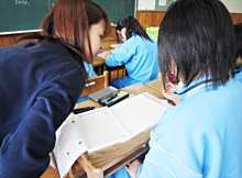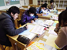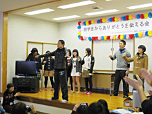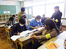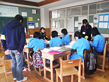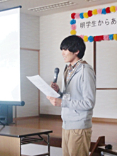 地区唯一の中学校である吉里吉里中学において、明学生は2011年8月から今まで継続的に授業サポートや定期試験前の学習支援活動を行っています。このような活動を通して得た交流から、今回の発表を実現することができました。
