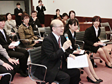 第一部ではボランティアセンターコーディネーター並びに学生から、「プロジェクトが大槌町や学生、大学にもたらした影響」についての基調報告、第二部では唐木清志先生から「復興支援活動を通して、学生は何を学べるか」をテーマとしての講演、第三部では「今後の大槌町・学生・明治学院大学による協働」をテーマにパネルディスカッションがありました。原田勝広センター長のモデレートのもと、伊藤正治教育長からは明学生によるボランティアに対する感謝や子どもへの影響について、齋藤百合子ボランティアセンター長補佐からはボランティアにおける学びについて、学生(国際学部2年生田さん、社会学部2年市川さん)は活動がどのように学びつながっているかなど活発な意見が出されました。その後、学生が司会となり伊藤教育長を囲んでのワークショップなどをおこないました。