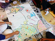 10月9日(日)にわんぱく広場を堤ヶ丘の仮設住宅の談話室にて開催し、未来の吉里吉里をマーブリングで描く合作をしました。吉里吉里の子どもは17 人、明学生は5人が参加しました。合作作業としては、マーブリングで紙をカラフルに染めた後、それらをちぎって模造紙に貼り一つの絵にしました。皆で協力して絵は完成しましたが、子どもたちの多くは合作よりも、純粋に私たちと再会した喜びから、外で元気に遊ぶことの方がよかったようです。子どもたちは私たちと一緒にいる時間を本当に楽しんでくれたようでしたが、今回は外遊びの環境が確保できなかったこと、また私たち学生も臨機応変な対応ができなかったことから、外で遊ぶことが叶わず寂しい思いをさせてしまったかと思います。次回からは思い切り体を動かせる企画を用意しようと思います。(法律学科1年 千吉良)