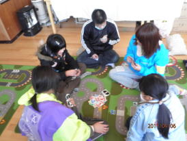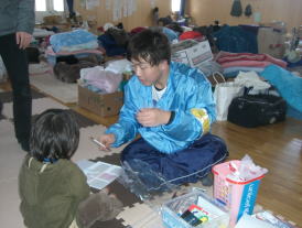 - 石巻市内にある避難所(石巻高校、青葉中学校、湊小学校、釜小学校)で被災した子どものケアのため、ユニセフ提供の「箱の中の幼稚園」キットやトランプ、ヒーローごっこなどで遊ぶ。