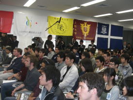 出陣式の会場には、30の大学の校旗がずらり並んだ