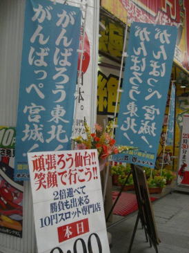 仙台市街には、あちこちに、「頑張ろう」のメッセージが。