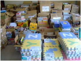 現地での支援は、日本ユニセフ協会との協働プログラムがスタートしました。このプログラムは、仙台の避難所にいる子どものケアを行うもので、デンマークから取り寄せた「箱の中の幼稚園」と「レクリエーションキット」を使って楽しい空間を作り出し、ここに明治学院大学生がボランティアとして参加する、というものです。